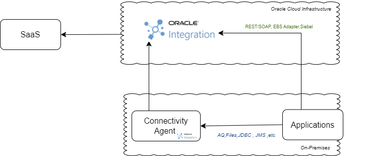 A première lecture , la plateforme Oracle Integration Cloud – OIC est dédiée aux intégrations Cloud to Cloud , comme l’integration de Saleforce avec ServiceNow par exemple. Pour ce type d’intégration SaaS-to-SaaS , nous n’avons pas besoin d’infrastructure supplémentaire en plus de ce que OIC fournit de base.