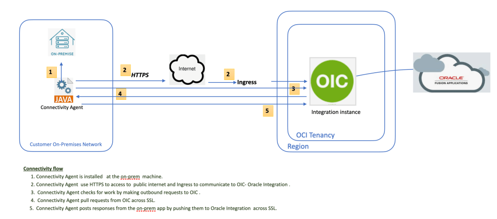 We define 4 main patterns that describe where you can deploy the connectivity agent , and how the connectivity flow is established between Oracle Integration instance and the connectivity agent in the context on an hybrid integration : customer On-Prem Network <> Oracle Integration <> SaaS solution.