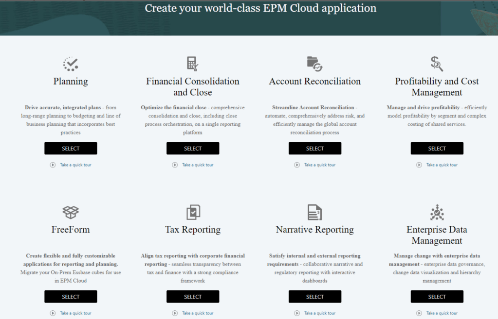 Oracle Cloud EPM Suite = { Planning and Forecasting + Profitability and Cost Mgt + Freeform + Consolidation and Close + Account Reconciliation + Tax Reporting + Narrative Reporting + Entreprise Data Mgt + EPM for. Sustainability }