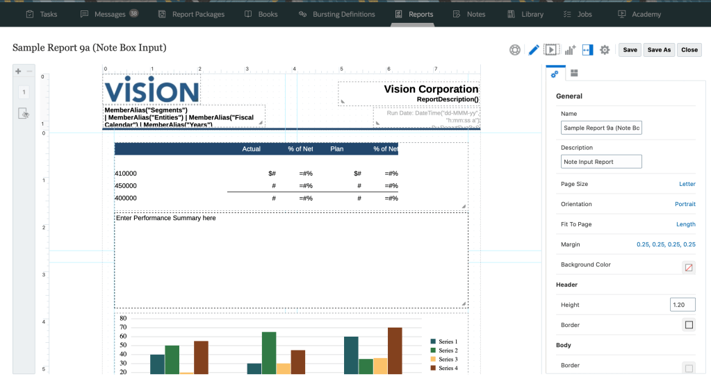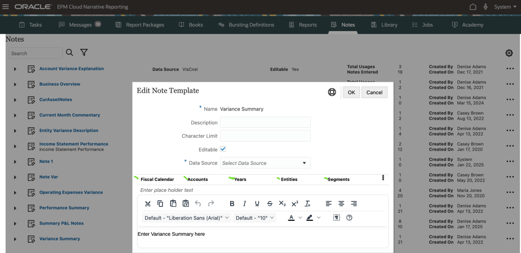 Narrative Reporting , is part of the Oracle Cloud EPM [Entreprise Performance Management] suite. It combine the data and narrative to generate a narrative report that includes both textual narrative, as well as numeric data, grids and charts. All done through the report Package feature that allows you to set up some workflow and collaboration to define a process, to assemble a narrative report, in Word , PPT, PDF format.