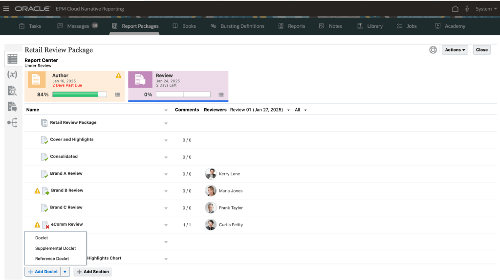 As part of Narrative Reporting , you find Report Packages, that is an unified structure for any report , it provides content workflow and approval management.