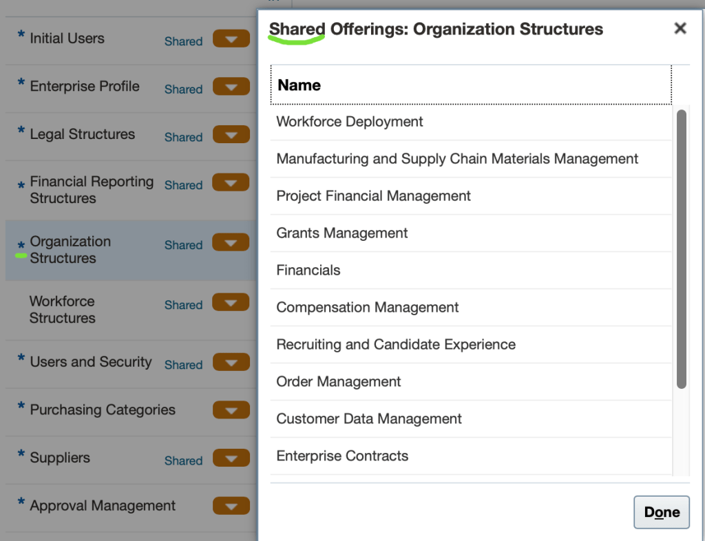 * Shared means shared mode , for example « Organizational Structures » is shared with other features,