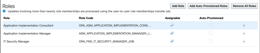 - Select the standard one : Application implementation consultant (more details about this job role : https://docs.oracle.com/en/cloud/saas/applications-common/25a/oacsm/Application_Implementation_Consultant_job_roles.html#Privileges) .